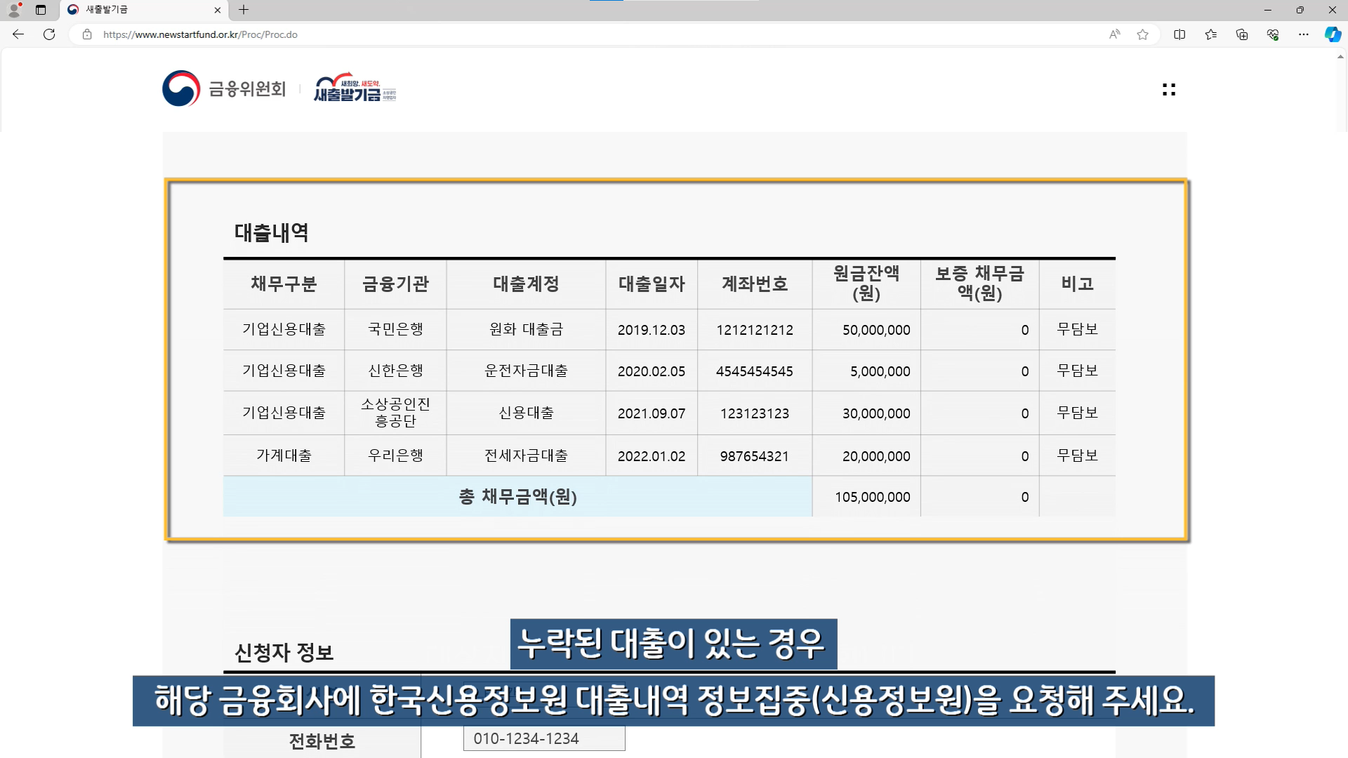 대출내역에서 누락된 대출이 있는 경우 해당 금융회사에 한국신용정보원 대출내역 정보집중(신용정보원)을 요청해 주세요.