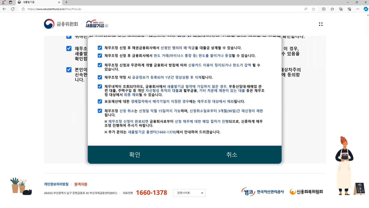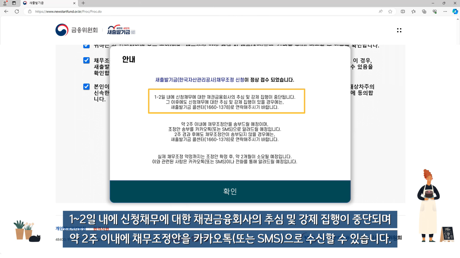 신청 정보관련 안내사항을 확인하고, 왼쪽박스에 체크 후 채무조정 신청제출 버튼을 누릅니다.
