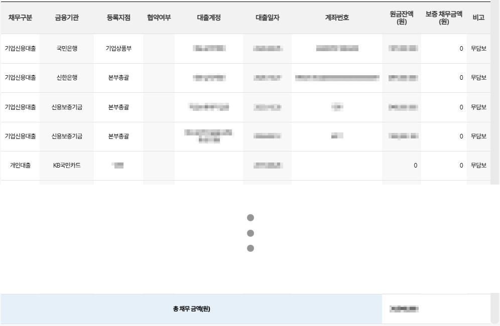 대출과 관련된 모든 은행의 내역과 대출 원금잔액등이 보여지게 됩니다.