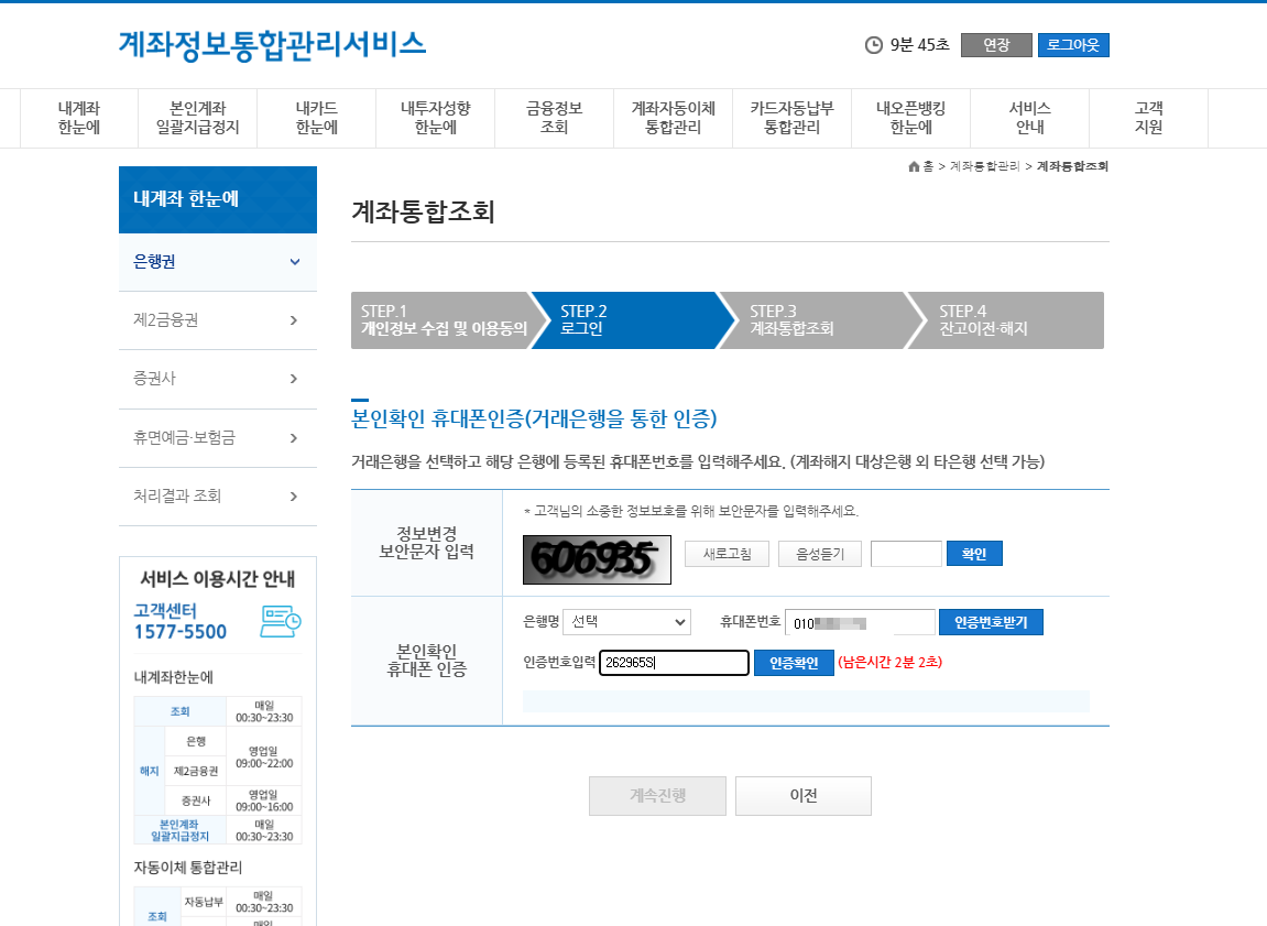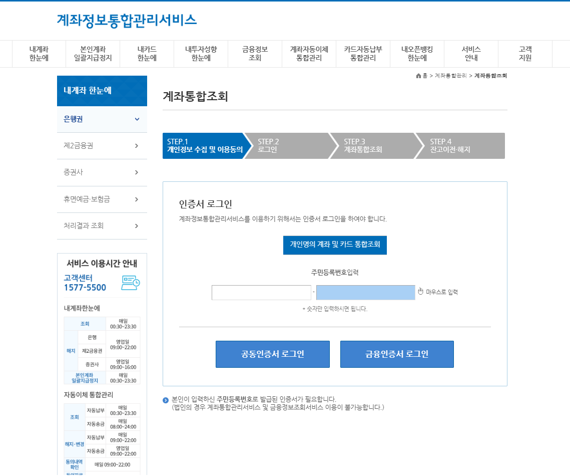 계좌정보통합관리서비스"내계좌 한눈에"버튼 클릭