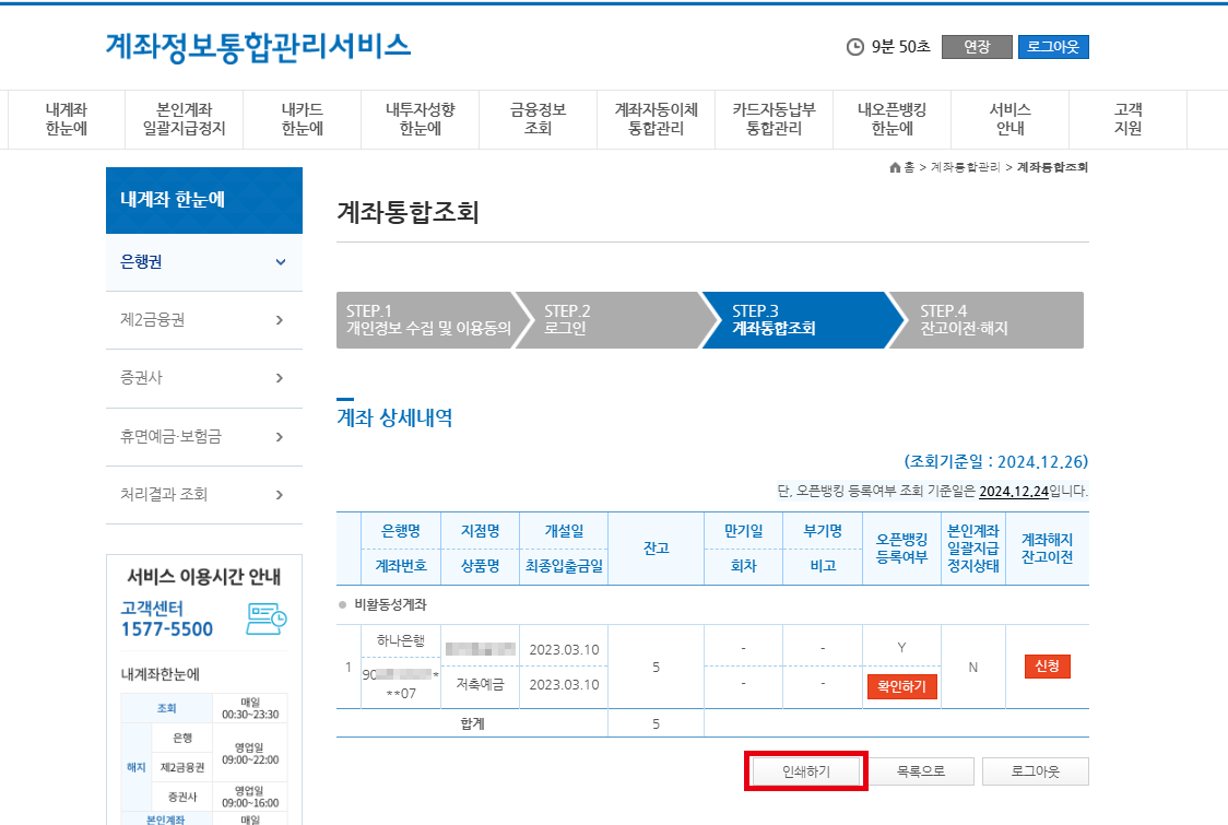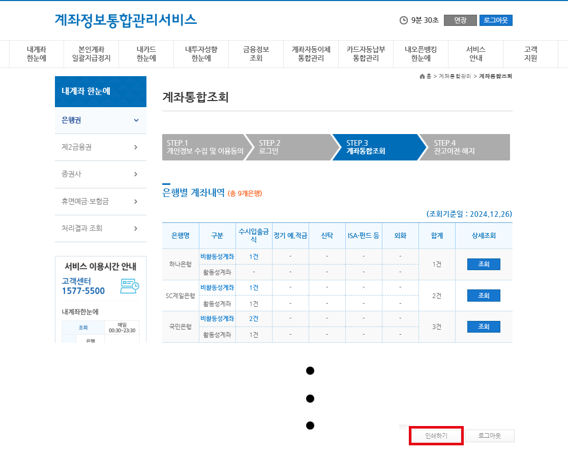 3.계좌통합조회 ( 은행권(1금융권) 계좌 전체내역(인쇄화면) )