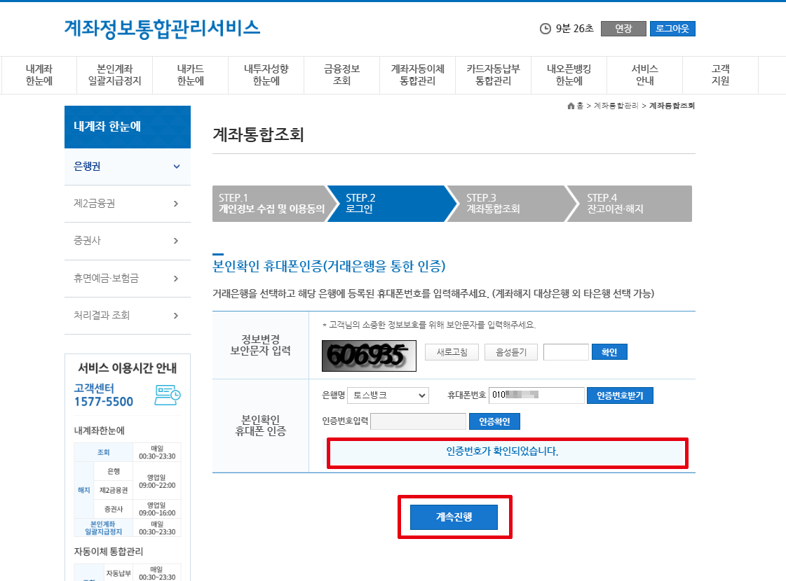 아래의 "계속진행" 버튼을 눌러 계좌통합조회로 이동합니다.