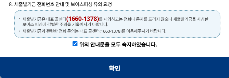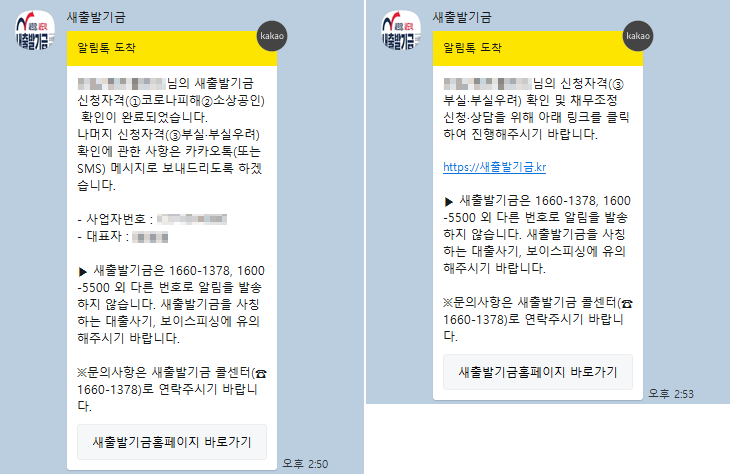 홍길동/업체명님의 새출발기금(한국자산관리공사) 채무조정 신청이 정상 접수되었습니다. 1-2일 내에 신청채무에 대한 채권금융회사의 추심 및 강제 집행이 중단됩니다. 그 이후에도 신청채무에 대한 추심 및 강제 집행이 있을 경우에는, 새출발기금 콜센터(1660-1378)로 연락해주시기 바랍니다. 약 2주 이내에 채무조정안을 송부드릴 예정이며, 조정안 송부를 카카오톡(또는 SMS)으로 알려드릴 예정입니다. 2주 경과 후에도 채무조정안이 송부되지 않을 경우에는, 새출발기금 콜센터(1660-1378)로 연락해주시기 바랍니다. 실제 채무조정 약정까지는 조정안 확정 후, 약 2개월이 소요될 예정입니다. 이와 관련된 사항은 카카오톡(또는 SMS)이나 전화를 통해 알려드릴 예정입니다. - 업체명 : 업체명 - 사업자번호 : 1234567890 - 대표자 : 홍길동 ※ 신청 결과표 확인 (https://새출발기금.kr/Rslt/Rslt.do) ▶ 새출발기금은 1660-1378, 1600-5500 외 다른 번호로 알림을 발송하지 않습니다. 새출발기금을 사칭하는 대출사기, 보이스피싱에 유의해주시기 바랍니다. ※문의사항은 새출발기금 콜센터(☎1660-1378)로 연락주시기 바랍니다. |