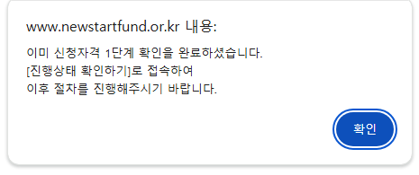 "신청 자격 확인"버튼을 클릭시 아래의 창이 새로이 나타나며, "확인" 버튼을 눌러 신청자격 1단계를 확인 하시면 됩니다.